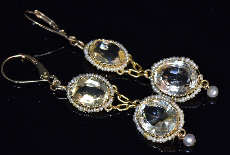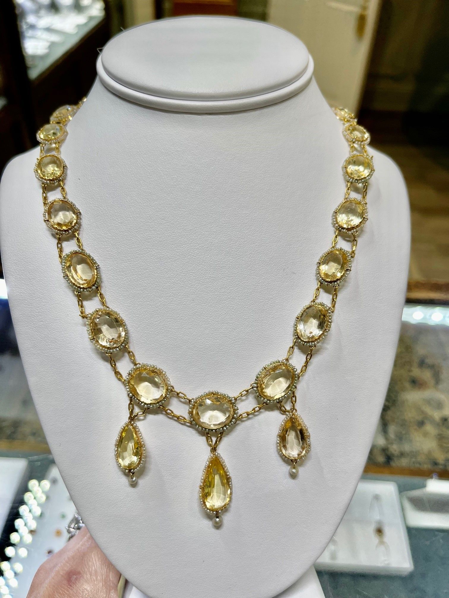 Hailing from the Art Nouveau Era this Necklace and Earring Set features stunning Oval and Pear Citrines that are encased by natural Seed Pearls. This set is crafted in 17 karat Yellow Gold.