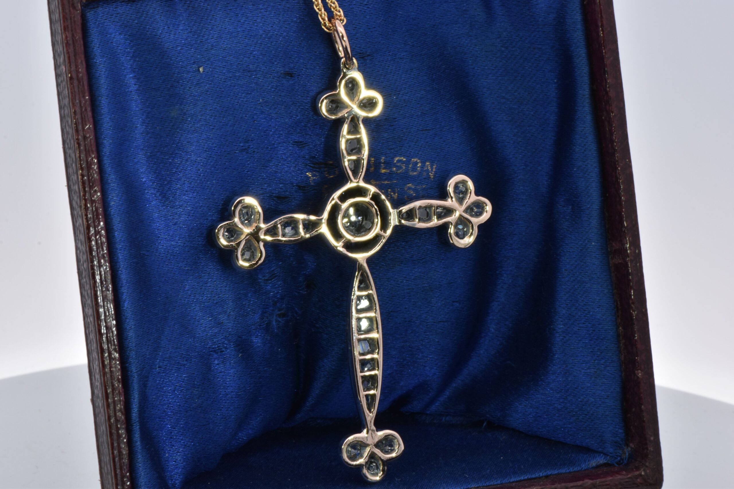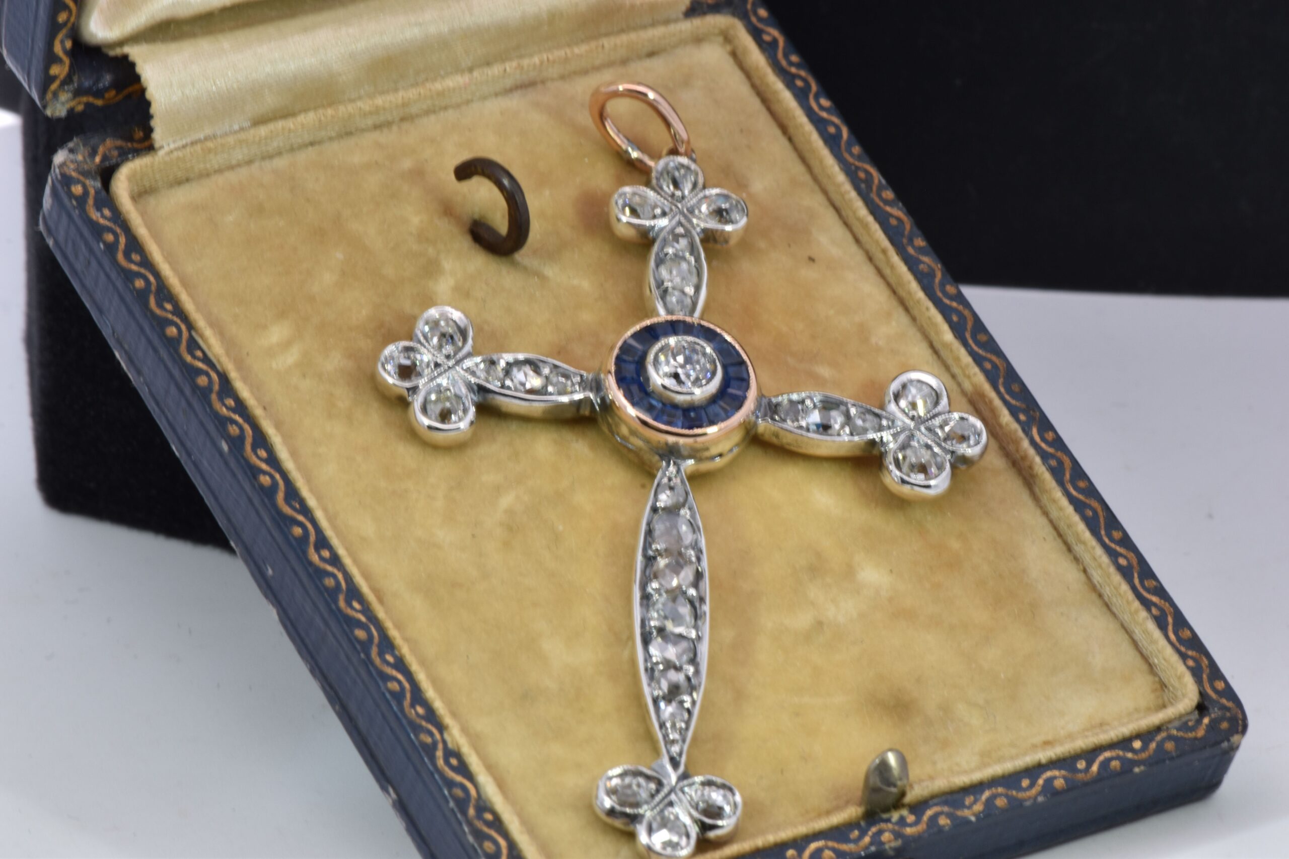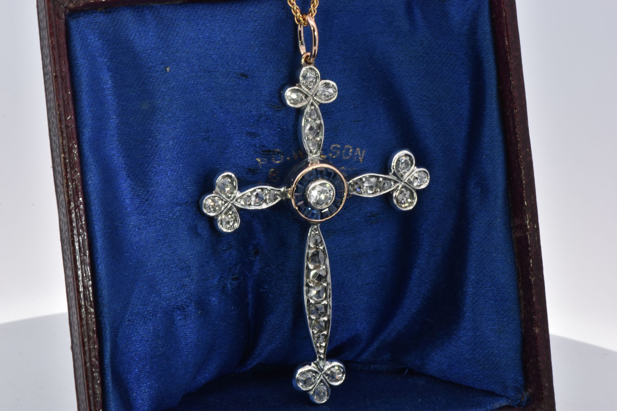 This Edwardian cross is hand fabricated using Silver over Gold. This cross holds approximatley 2.50 carats total of Antique cut Diamonds. Accenting these Diamonds is a Blue Sapphire halo that is channel set around the Center Diamond.