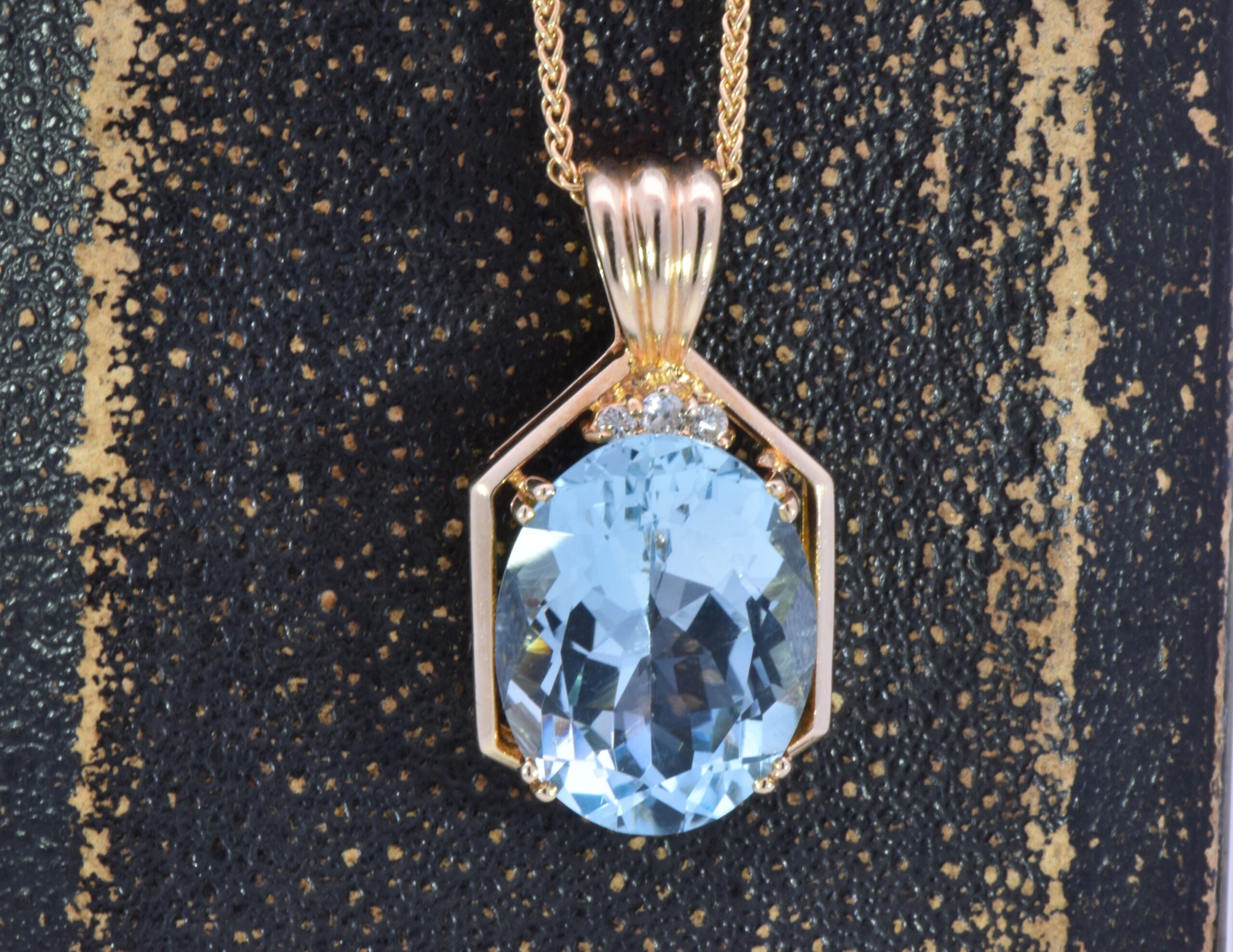 This Retro penadant has a dazzling 12.25 carat Oval Aquamarine that is accented by Round Brilliant cut Diamonds. The pendant sits on a 20 inch Diamond cut rope chain. This necklace is fabricated in 14 karat Yellow Gold.