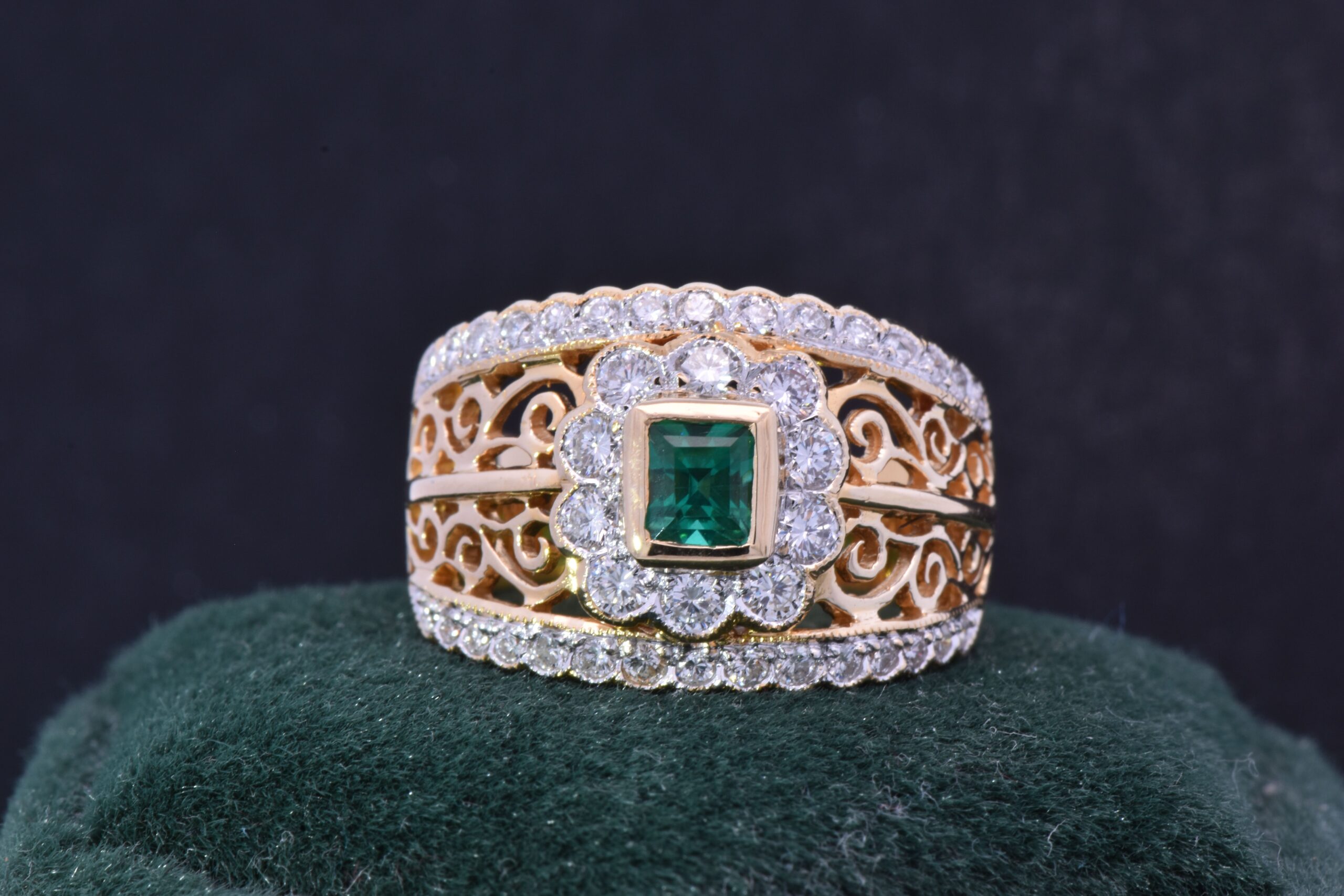 This ring features an elegant filigree that is encased by Diamonds. Centering this ring is a 0.65 Emerald that is also encased with Diamonds. The Diamonds weigh approximatley 0.70 carats total. The ring is hand crafted in 18 karat Yellow Gold.