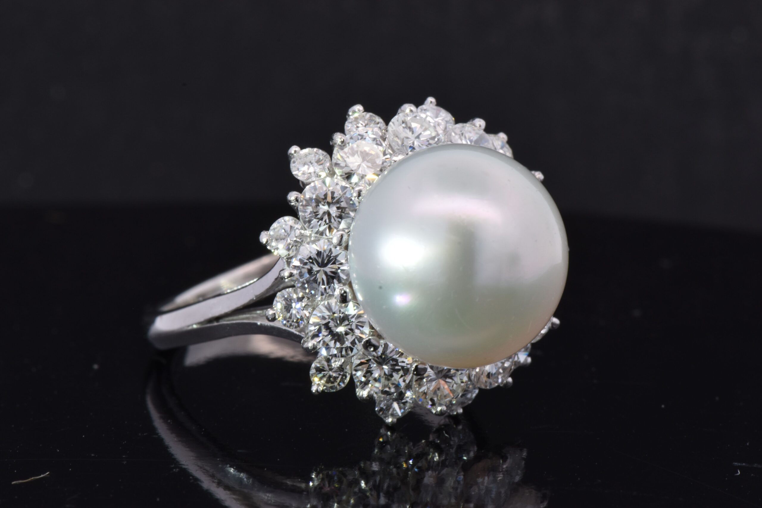 Centering this ring is a stunning 11.8mm White Pearl. Surrounding this Pearl is a double halo of Round Brilliant cut Diamonds that weigh 2.40 carats total. This ring is fabricated in Platinum.