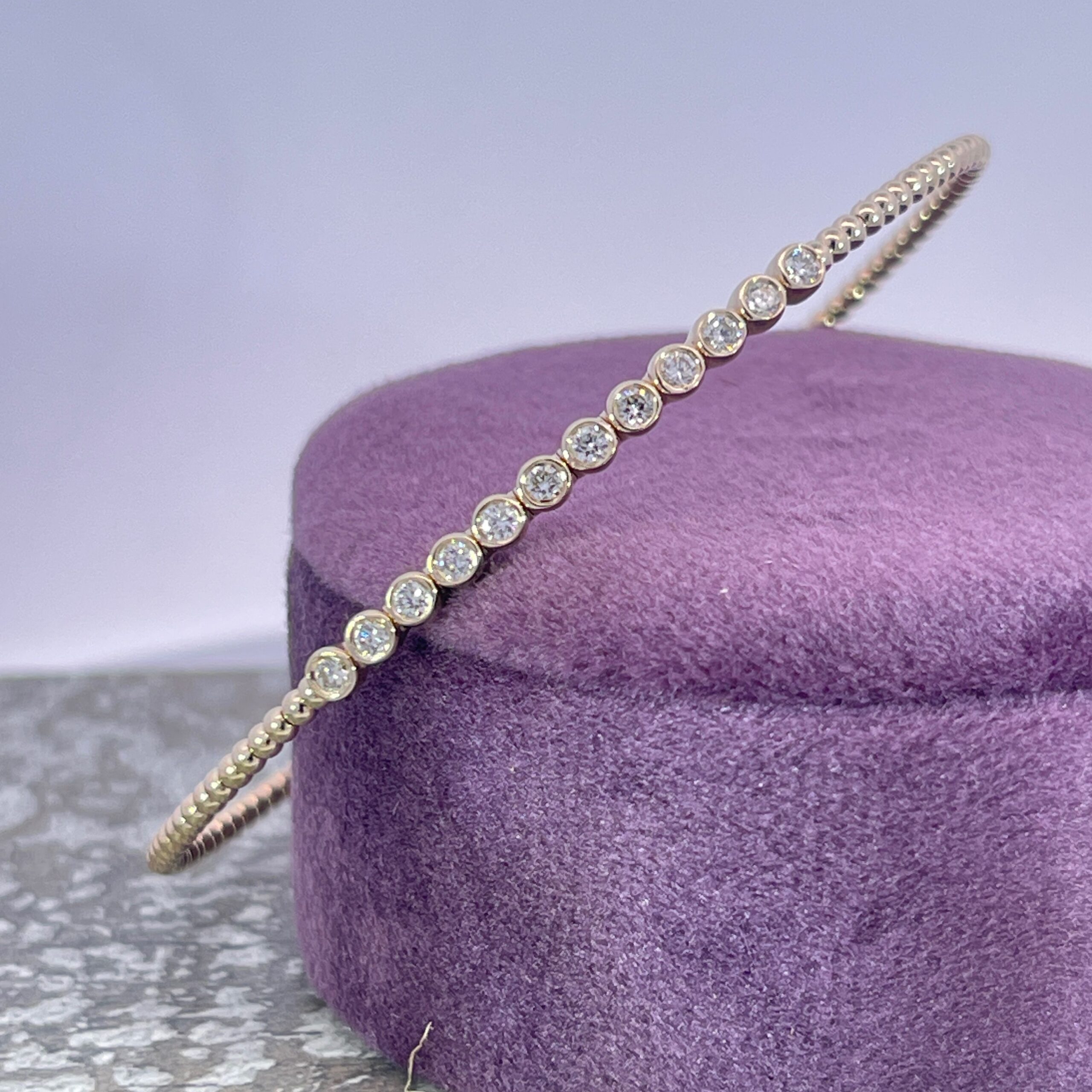 Centering this beaded bangle braclet is 12 bezel set Round Brilliant cut Diamonds. The Diamonds weigh 0.36 carats total. This bracelet is crafted in 14 karat Yellow Gold.