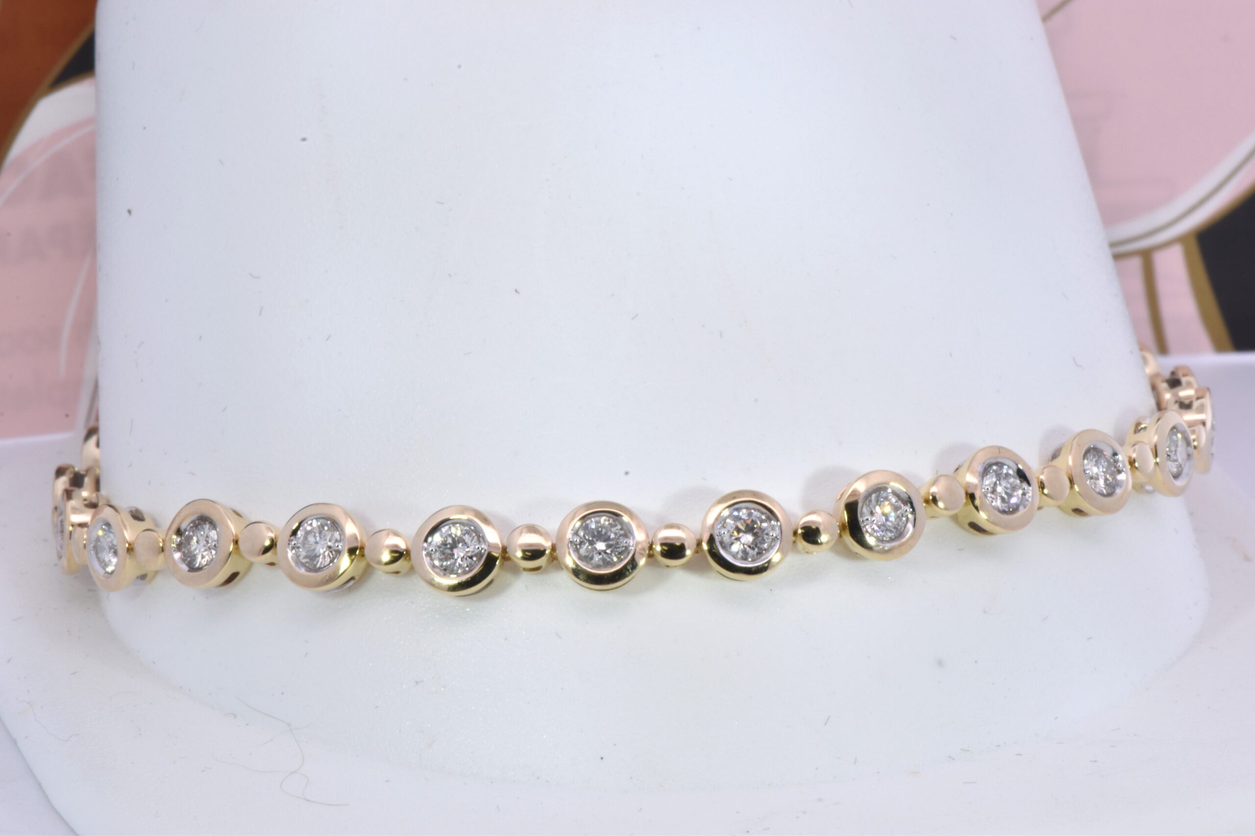 Round Brilliant Diamonds are bezel set into a 14 karat Yellow Gold tennis bracelet mounting. The Diamonds weigh 1.89 carats total. This bracelet is 7.5 inches long.
