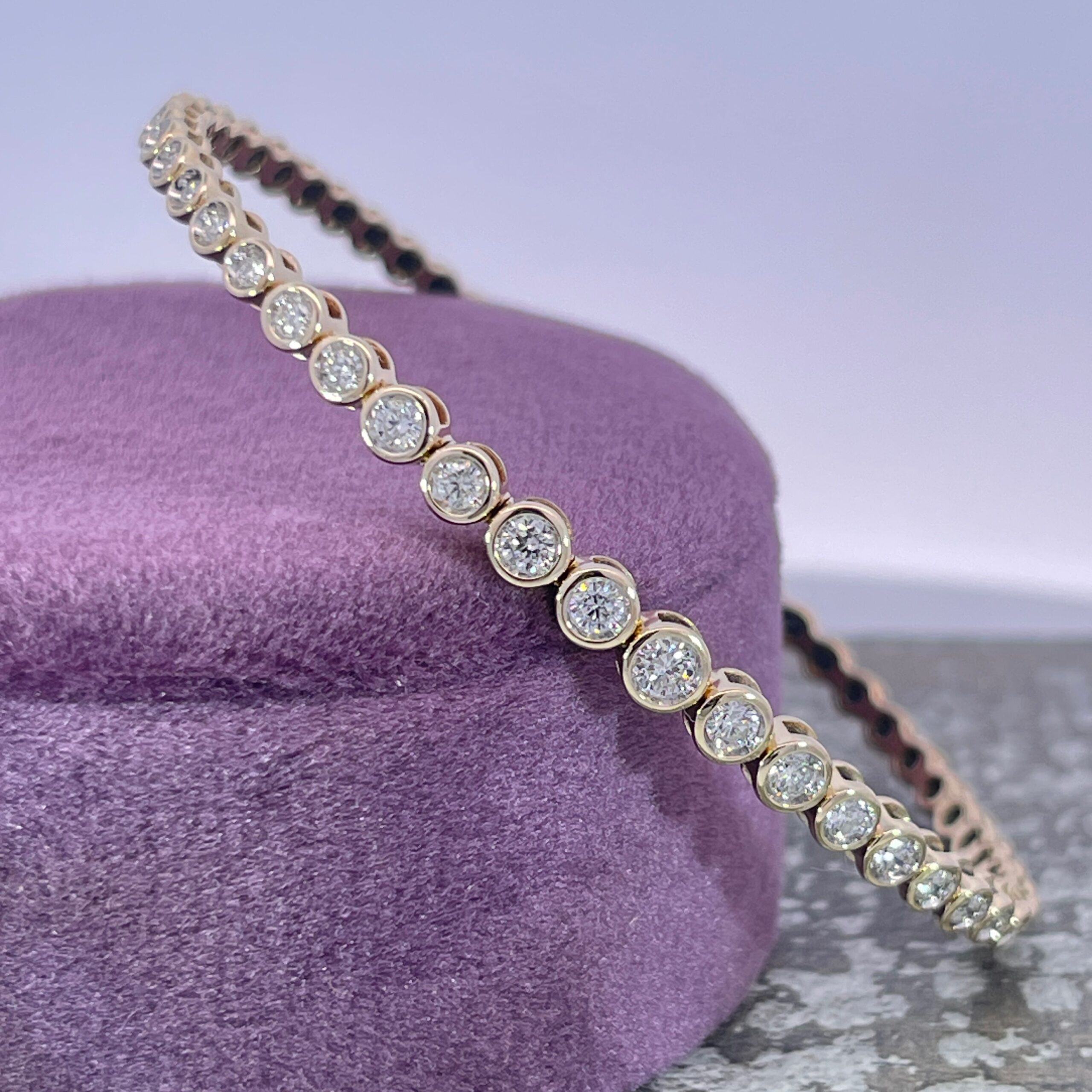 This bangle bracelet features 0.91 carats of Round Brilliant cut Diamonds that graduate in size. The Diamonds are bezel set in 14 karat Yellow Gold. This looks stunning worn separately or stacked.