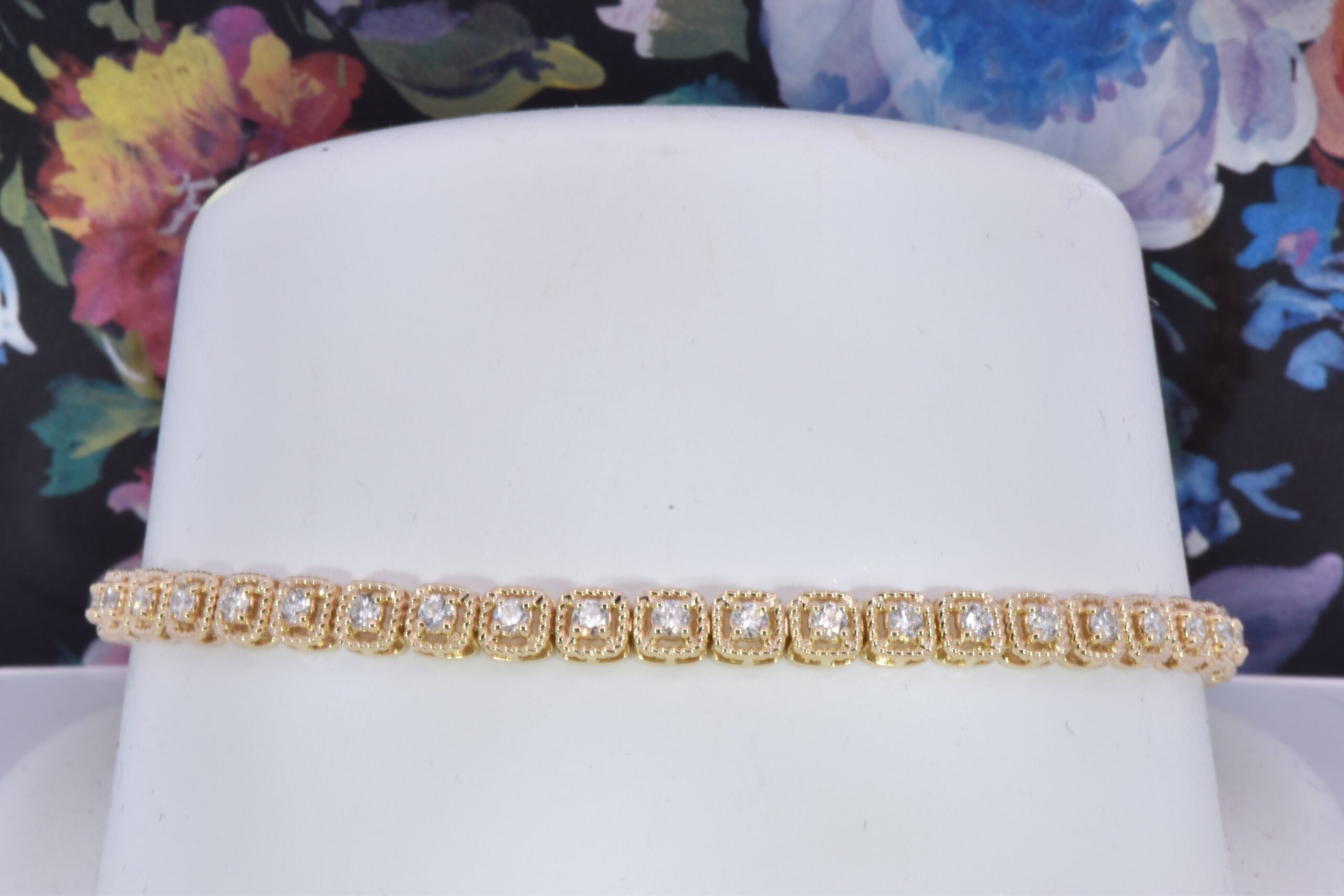 14 karat Yellow Gold tennis braclet. Each link is a square Milgrain design set with a Round Brilliant cut Diamond. The Diamonds weigh 1.33 carats total and are GH color and VS in clarity.