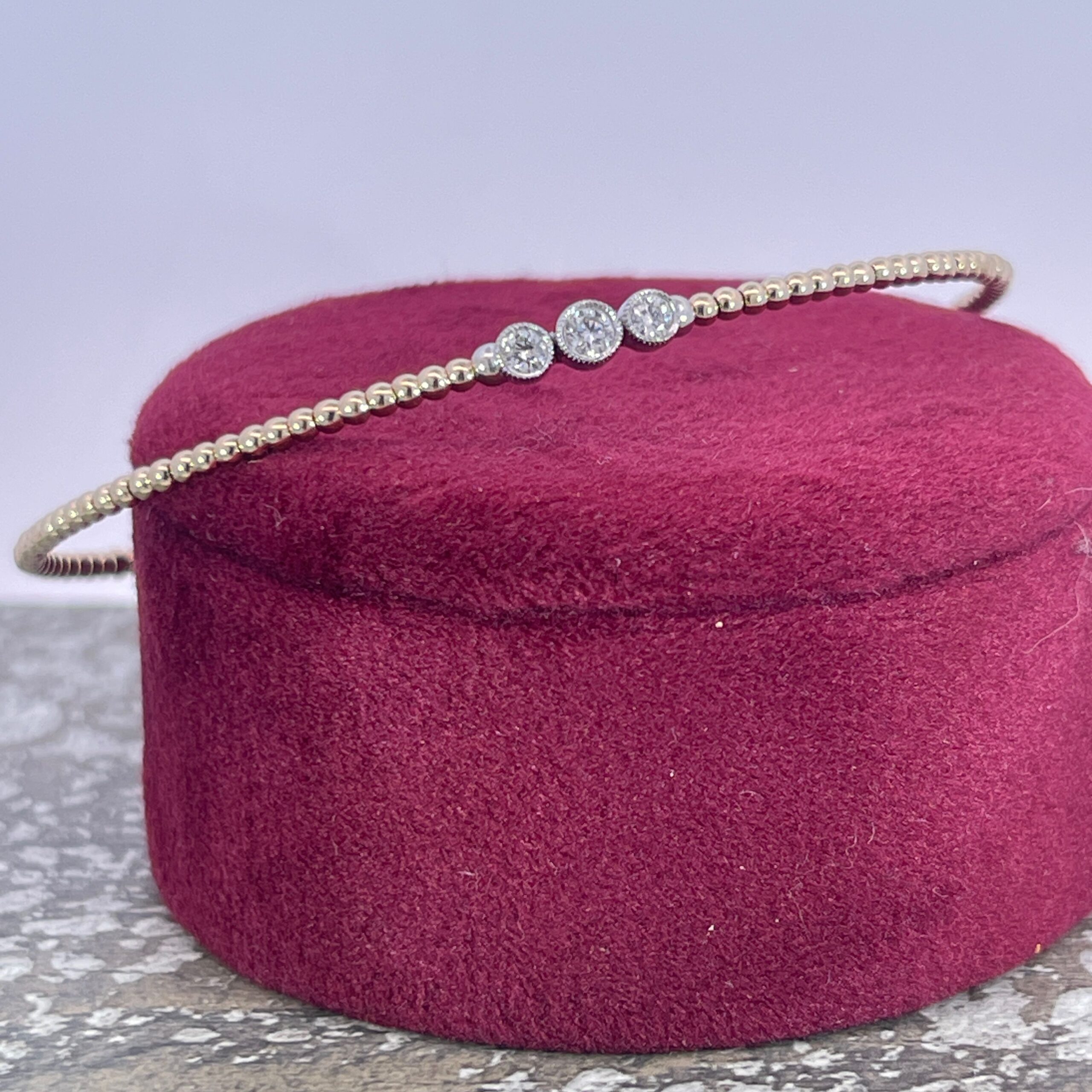 Two Toned 14 karat Gold beaded bangle bracelet. Centering the bracelet is three Round Brilliant cut Diamonds. The Diamonds are bezel set and weigh 0.18 carats total.