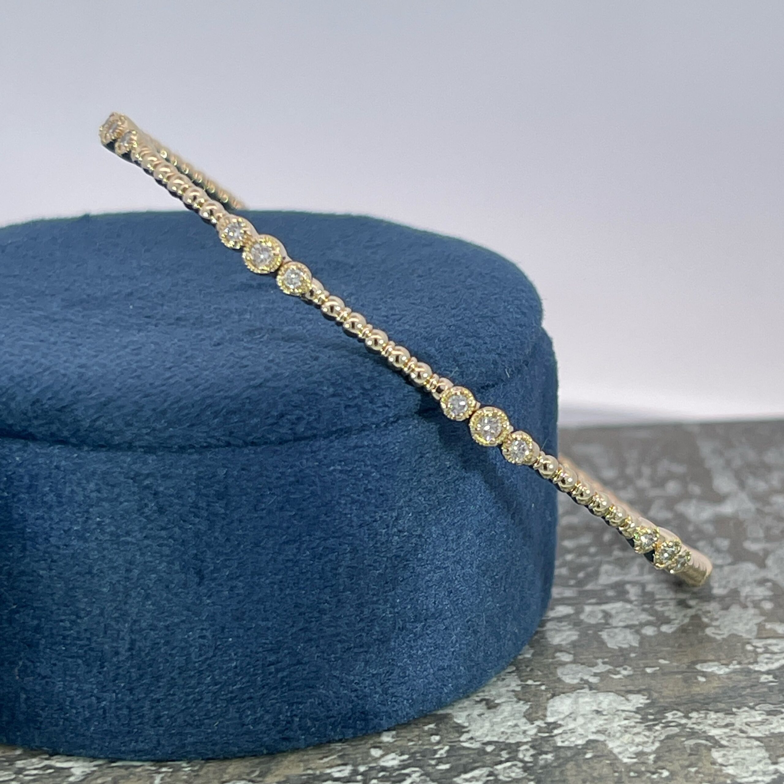 This beaded bangle bracelet has 5 sections of 3 Round Brilliant cut Diamonds that are bezel set. The Diamonds weigh 0.35 carats total. It is fabricated in 14 karat Yellow Gold.