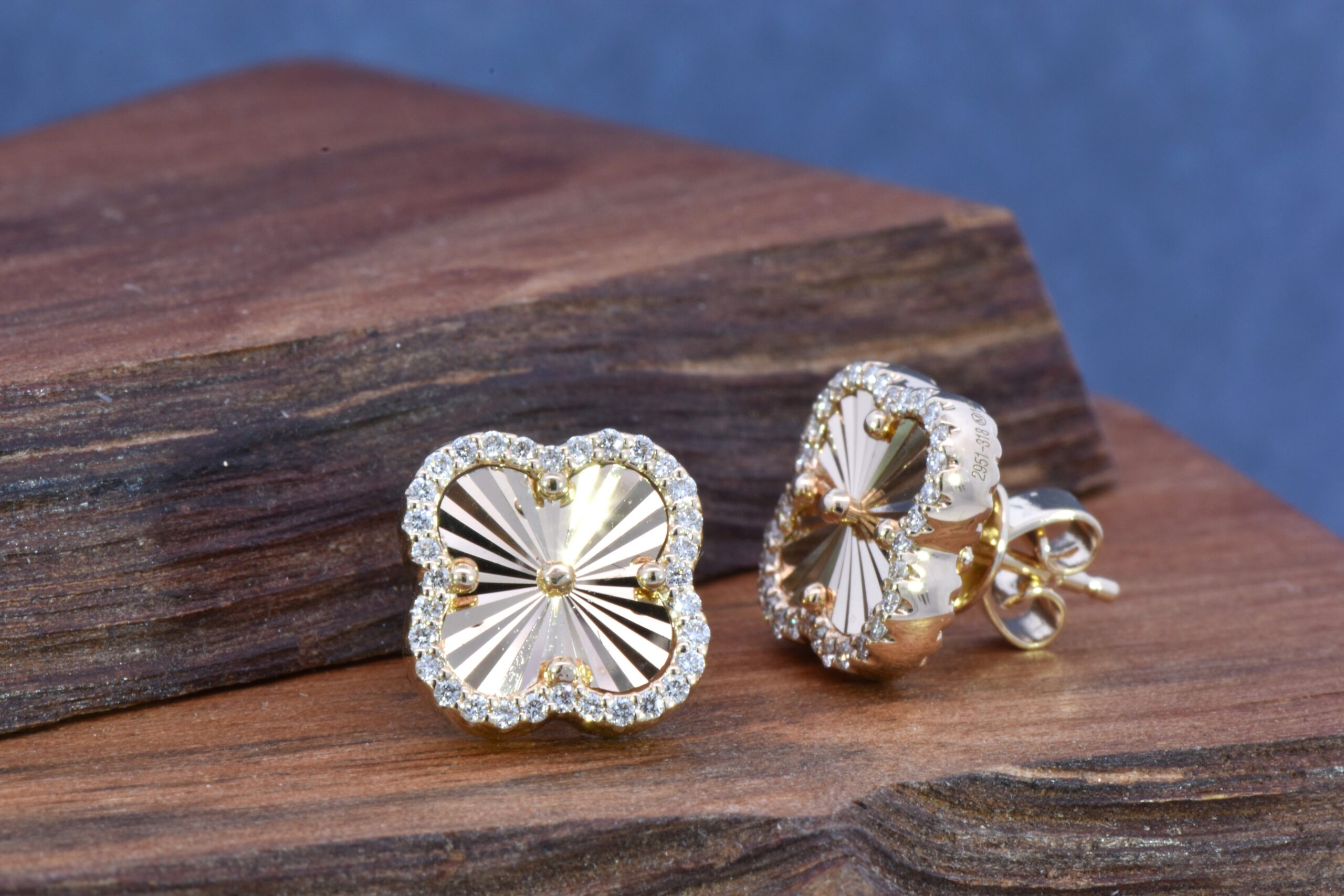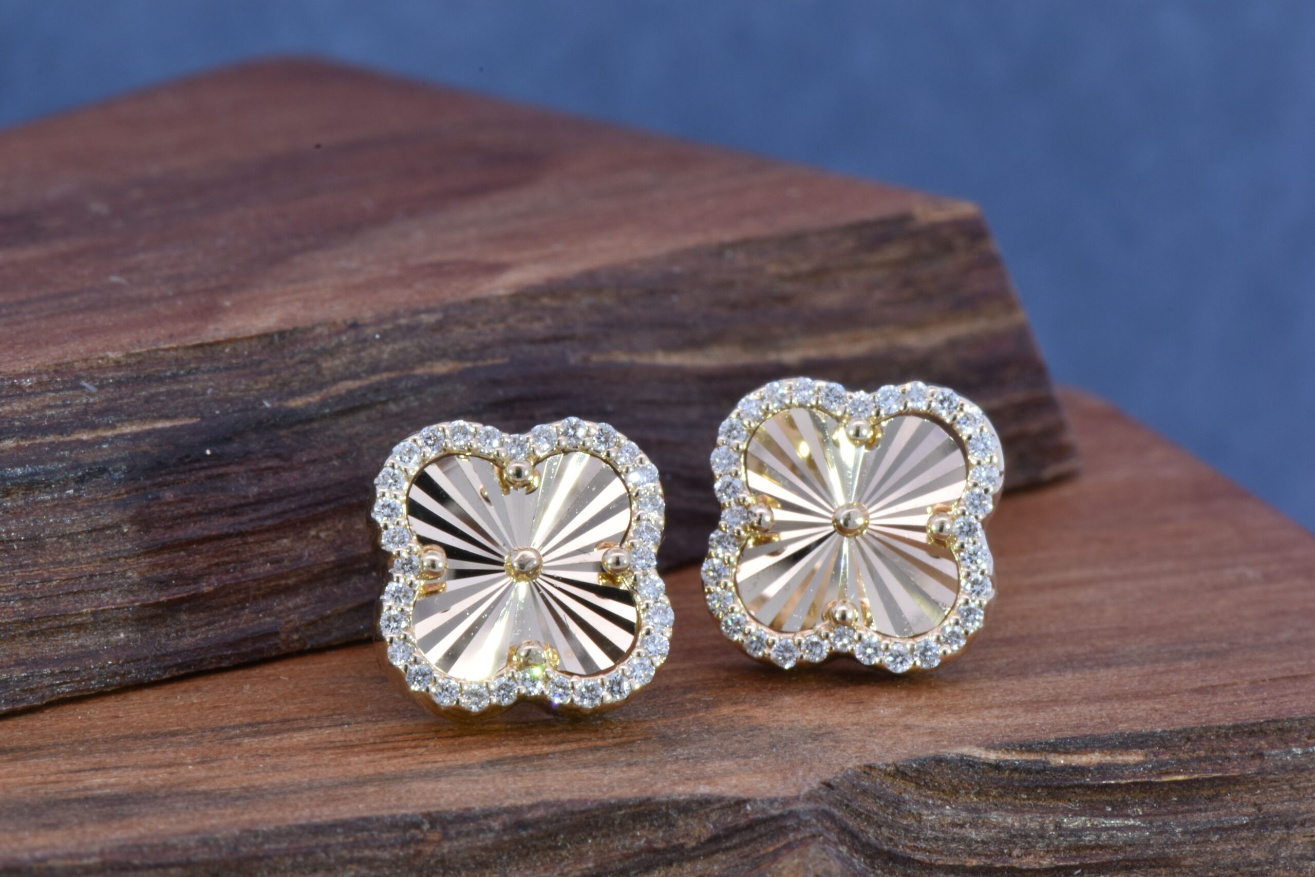 These faceted Clover stud earrings feature a halo made of Round Brilliant cut Diamonds. The Diamonds weigh 0.23 carats total. The earrings are crafted in 14 karat Yellow Gold.
