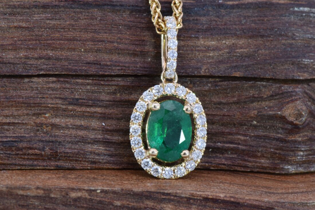 Centered in this 14 karat Yellow Gold pendant is a vibrant Oval Emerald weighing .64 carats. Around the Emerald is a halo of Round Brilliant cut Diamonds that continues onto the bail. The diamonds weigh .20 carats total.