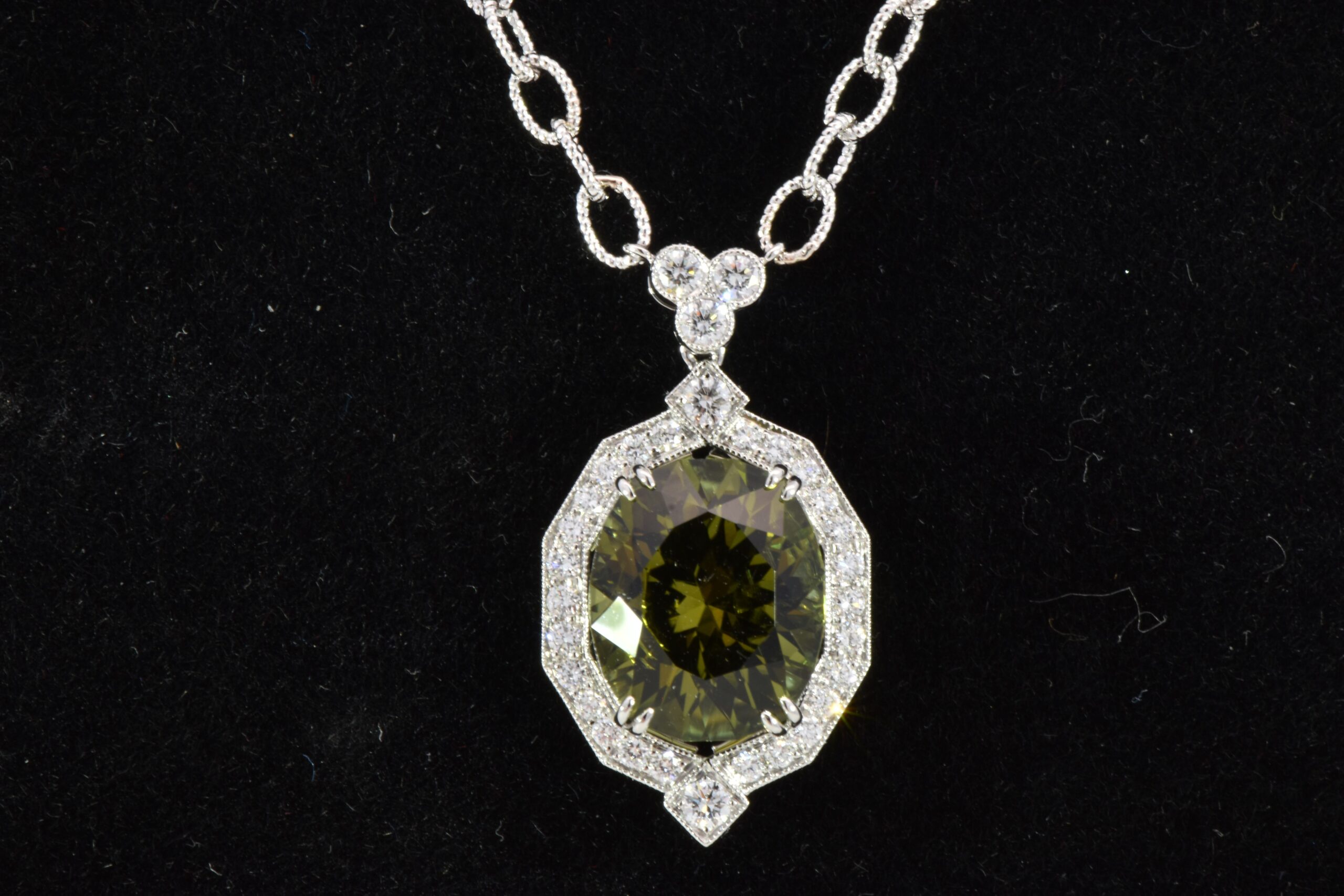 A 5.05 carat Oval Green Tourmaline is set into a Platinum mounting. The Tourmaline is accented by 0.45 carats total of Round Brilliant cut Diamonds that continue onto the bail.
