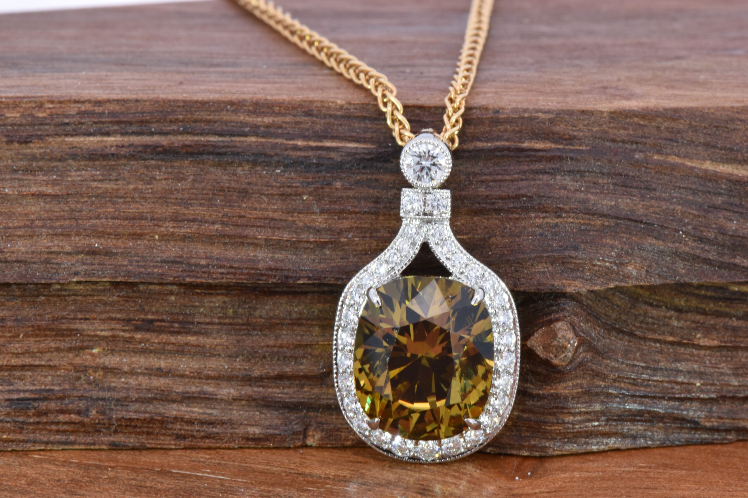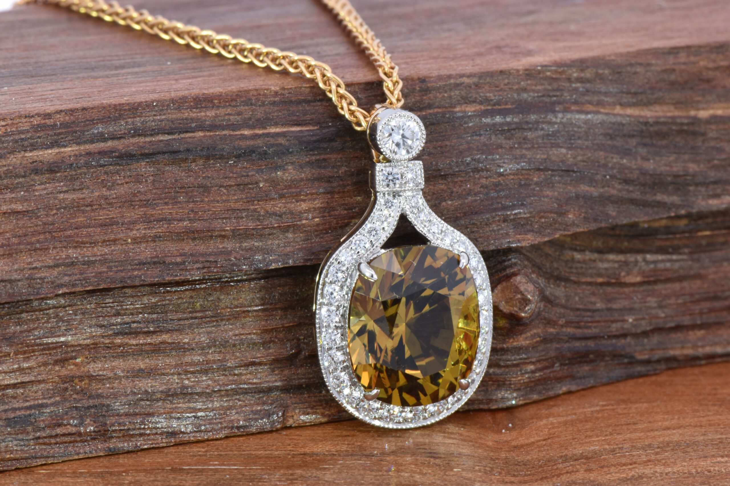 Glowing in the center of this pendant is a 4.15 carat Cushion cut Mali Garnet. Encasing the Garnet is a halo made of Round Brilliant cut Diamonds that continue onto the bail. The Diamonds weigh 0.30 carats total. This pendant is fabricated in 18 karat Yellow Gold and Platinum.