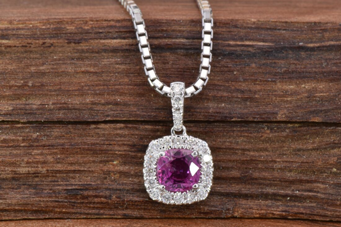 This luminous .57 carat Cushion cut Pink Sapphire is beautifully framed by a halo of Round Brilliant cut Diamonds that weigh .13 carats total. The pendant is fabricated in 14 karat White Gold and is finished with a Diamond bail.