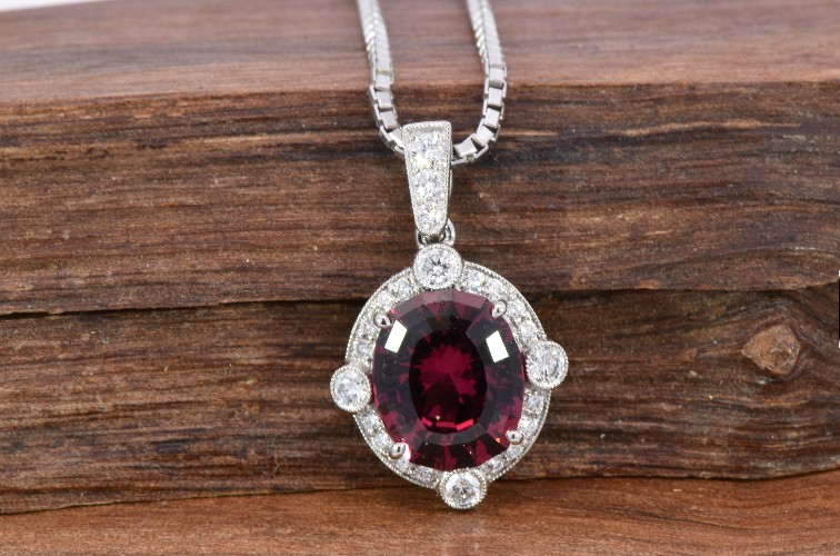 Centering this pendant is an eye catching 3.04 carat Cushion cut Garnet. Surrounding the Garnet is 0.28 carats total of Round Brilliant cut Diamonds that continue onto the bail. This pendant is crafted in Platinum.
