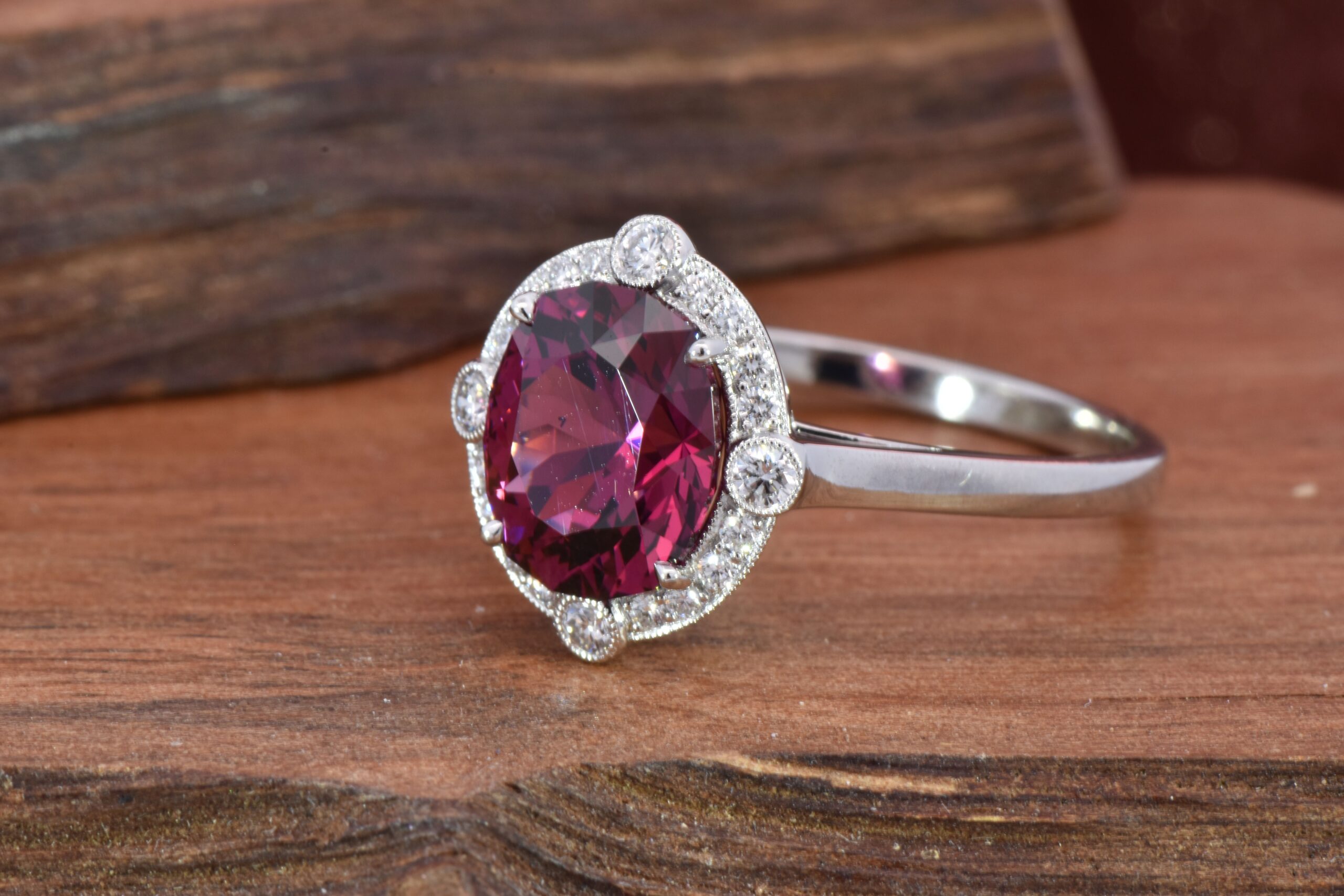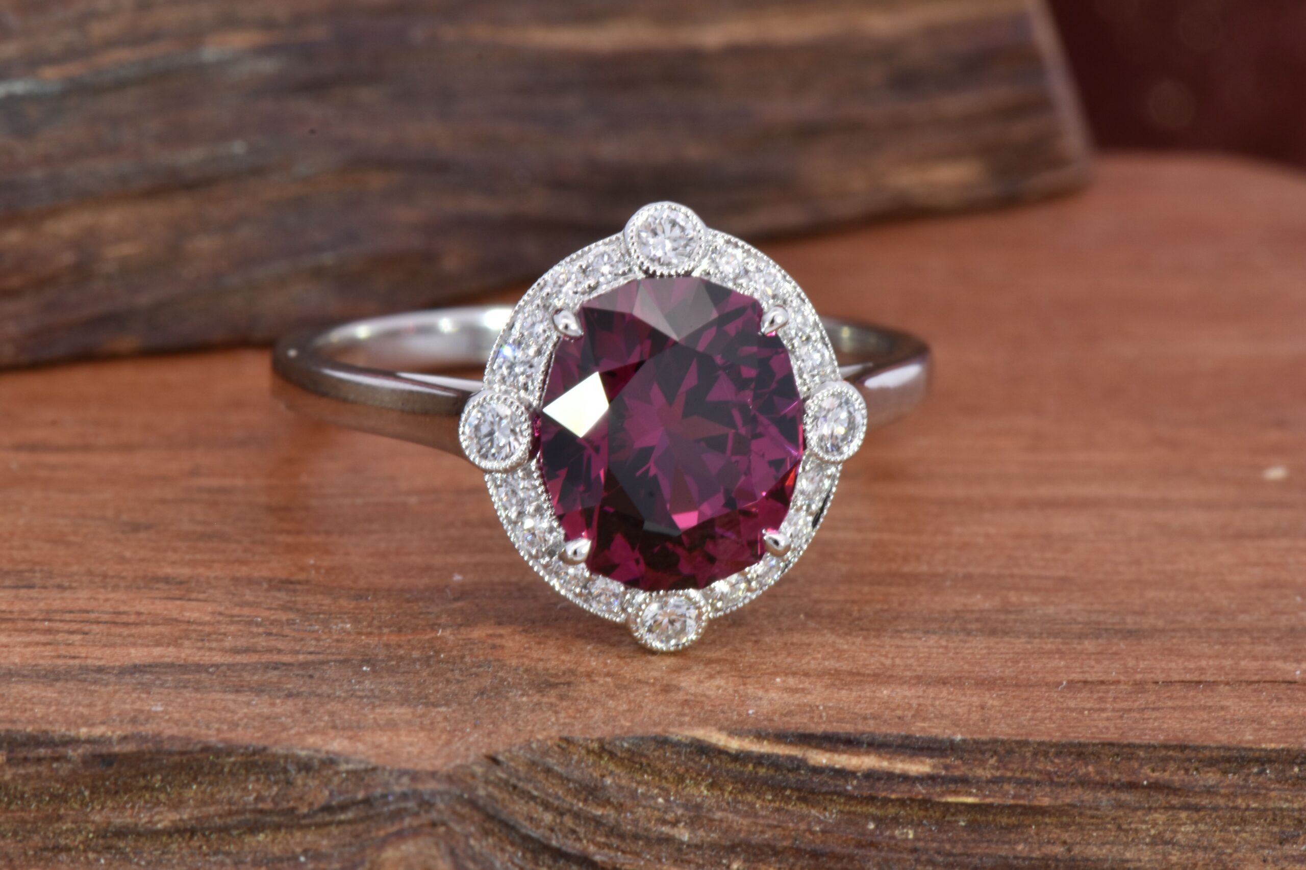 Fabricated in Platinum, this rings holds a 2.75 carat Cushion cut AAA Garnet. Accenting the Garnet is halo made of Round Brilliant cut Diamonds. The Diamonds weigh 0.20 carats total. This ring is currenlty a size 7 and can be modified for the perfect fit!