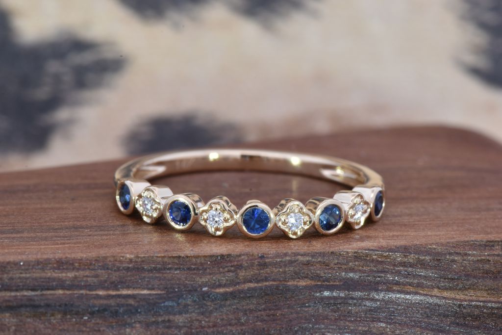 This band has alternating Round Brilliant cut Diamonds and Blue Sapphires that are set in a clover and circle pattern. The Sapphires weigh 0.23 carats total and the Diamonds are 0.04 carats total. The band is fabricated in 14 karat Yellow Gold and is currently a size 7.