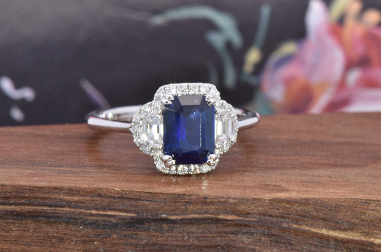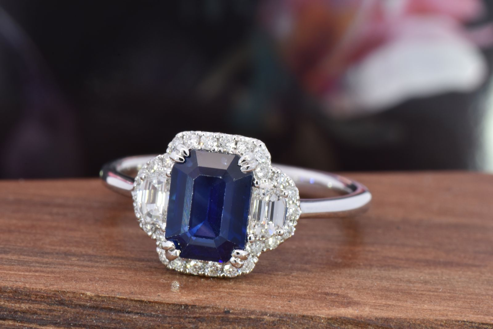 Centering this ring is a stunning 1.66 carat Emerald cut Blue Sapphire. On each shoulder of the Sapphire is a matching Half Moon cut Diamond that weighs 0.29 carats total. Encasing those stones is a halo of Round Brilliant cut Diamonds that weighs 0.17 carats total. This ring is fabricated in 14 karat White Gold and is currently a size 7.