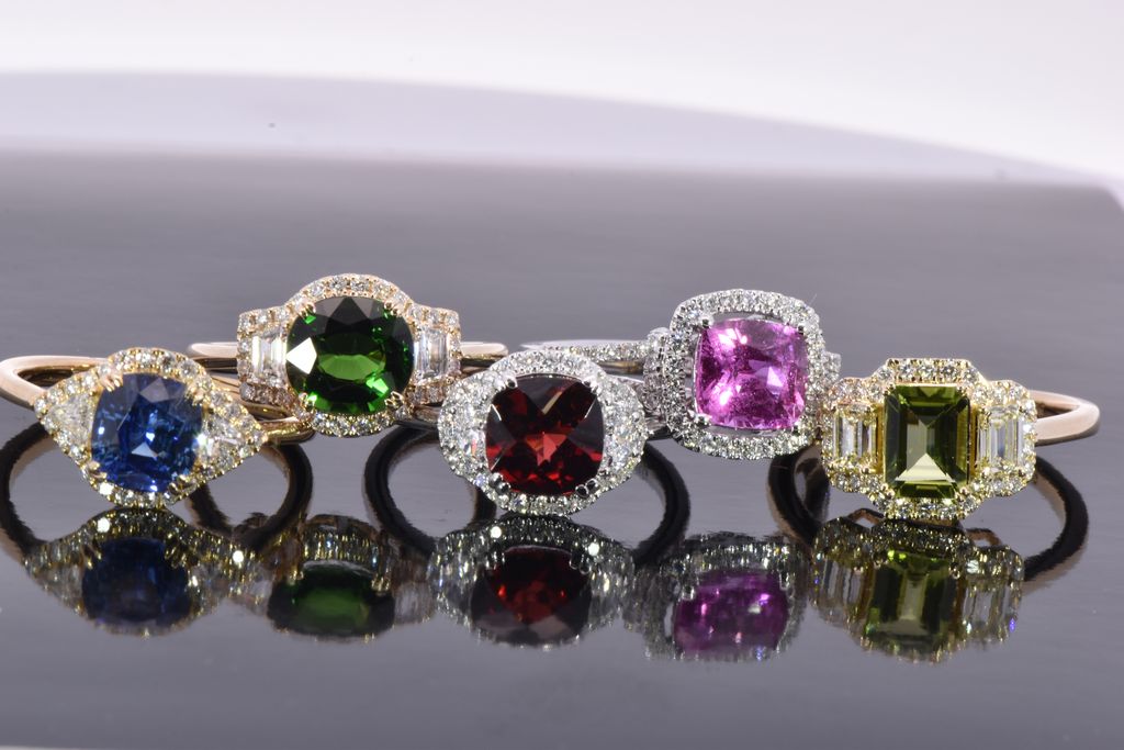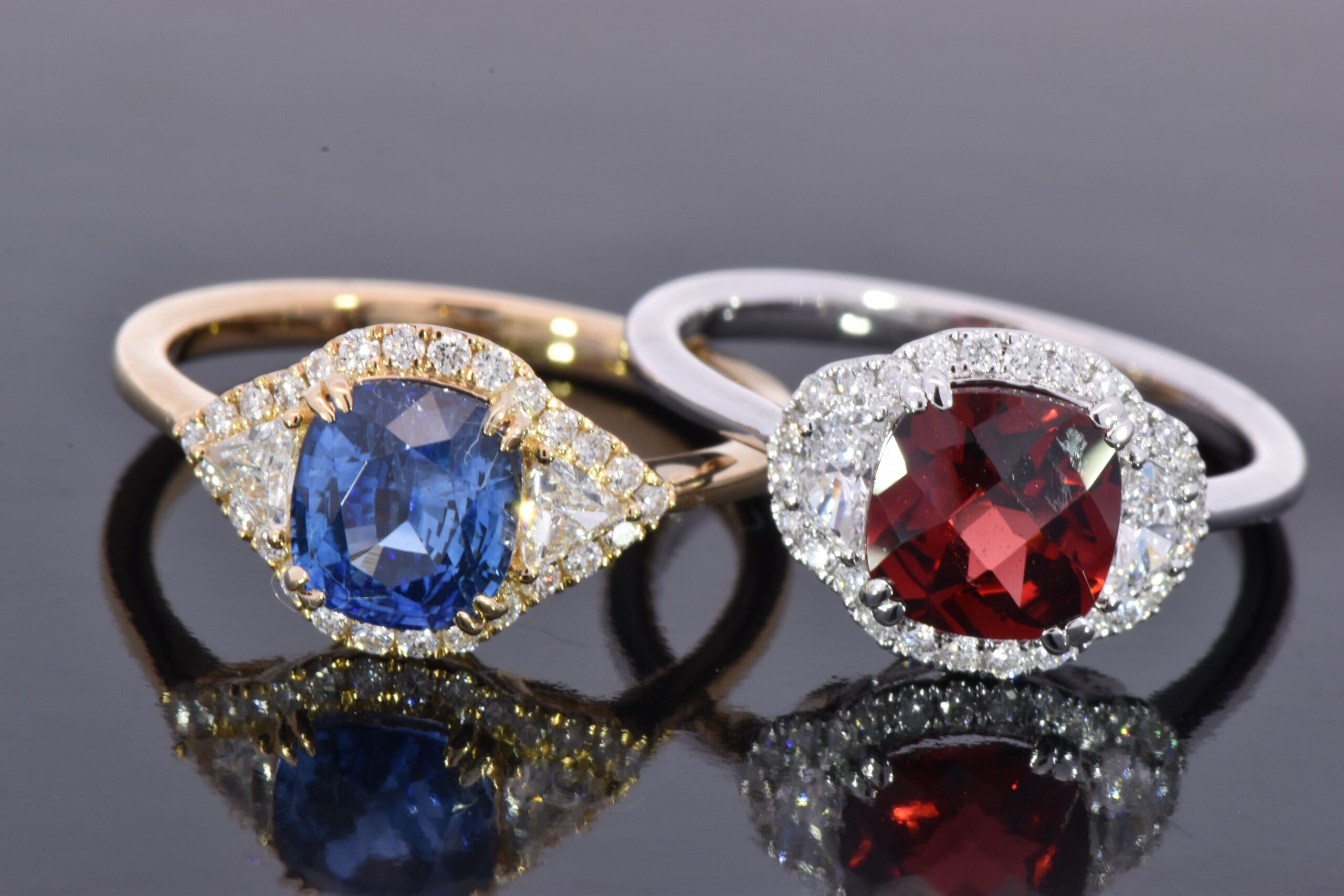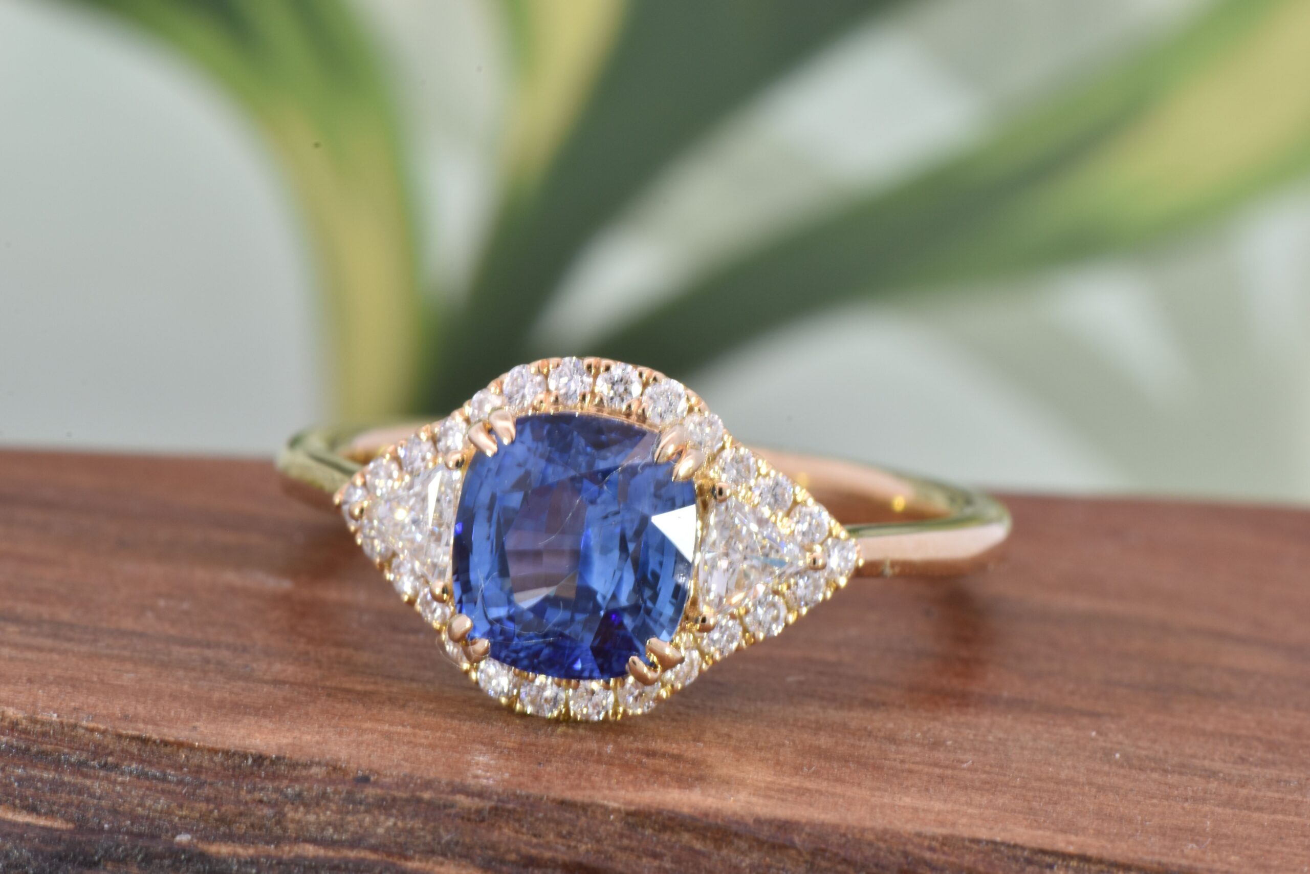 This 18 karat Yellow Gold ring is centered with a dazzling 2.16 carat Cushion cut Blue Sapphire. On each shoulder is a matching Trillion cut Diamond weighing 0.22 carats total. Surrounding these stones is a Diamond halo that weighs 0.20 carats total. This ring is currenlty a size 7 and can be modified for the perfect fit!