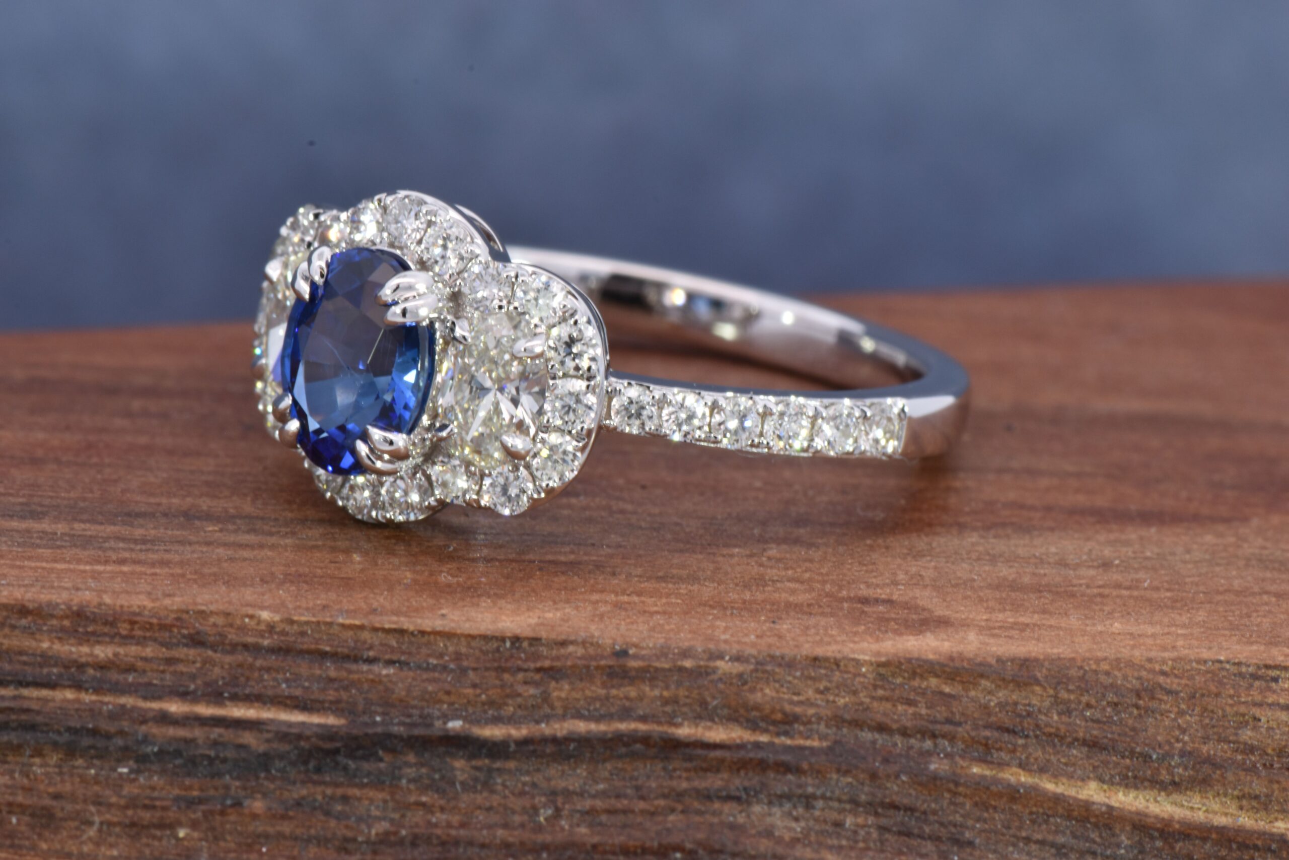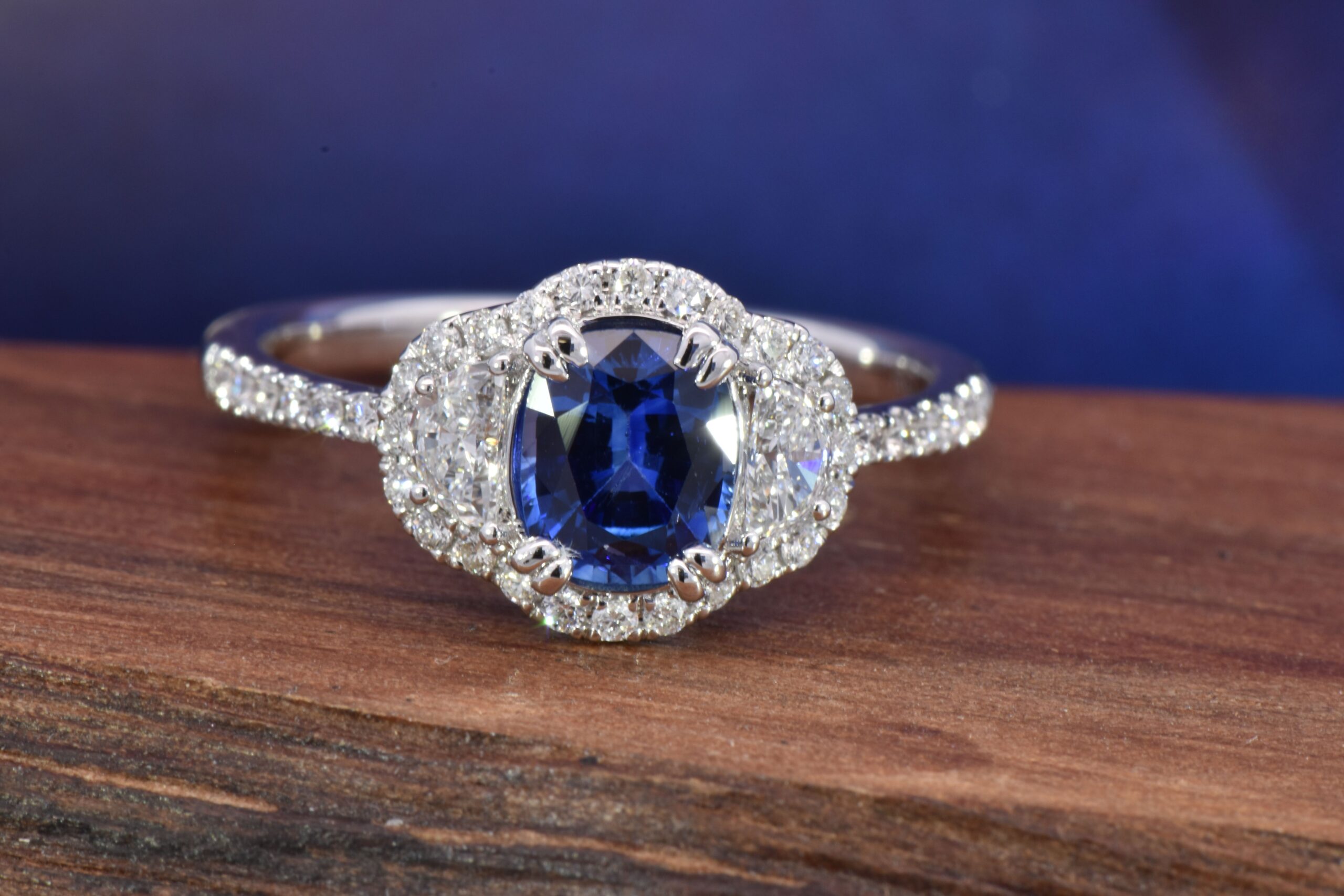 Centering this ring is a vibrant 1.00 carat Oval Blue Sapphire. On each shoulder of the ring there is a matched pair of Half Moon Diamonds weighing 0.21 carats total. Encasing these stones is a halo of Round Brilliant cut Diamonds that weigh 0.23 carats total. This ring is fabricated in 14 karat White Gold and is currently a size 7.
