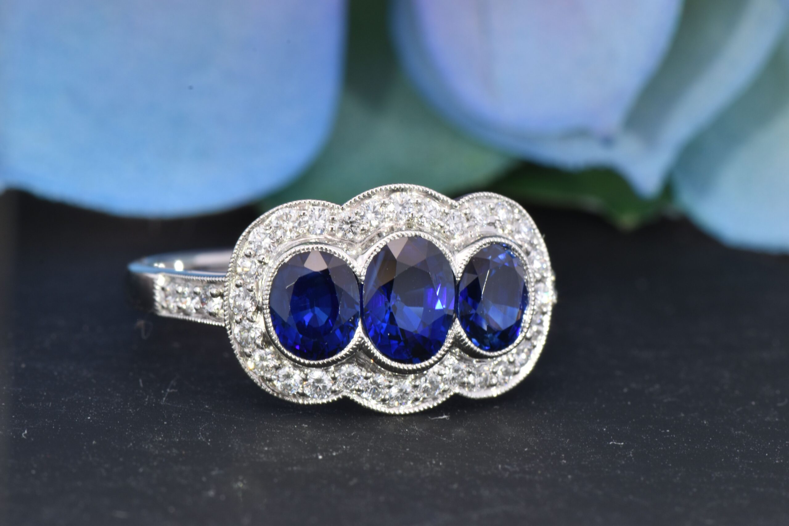 Three Fine Oval Blue Sapphires weighing 1.77 carats total are bezel set. Surrounding these stones and continuing onto the band are Round Brilliant Cut Diamonds that weigh 0.32 carats total. This ring is crafted in Platinum and is currently a size 7 and can be adjusted.