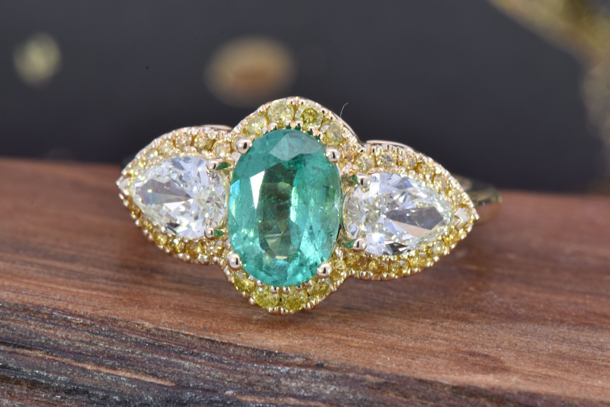 This three stone ring is centered with a remarkable 1.07 carat Oval Emerald. On each side of the Emerald is a matched Pear Diamond that weighs 0.83 carats total. Surrounding these stones is a halo of Round Brilliant cut Yellow Diamonds weighing 0.28 carats total. This ring is fabricated in 18 karat Yellow Gold and is currently a size 7 that can be modified for the perfect fit!