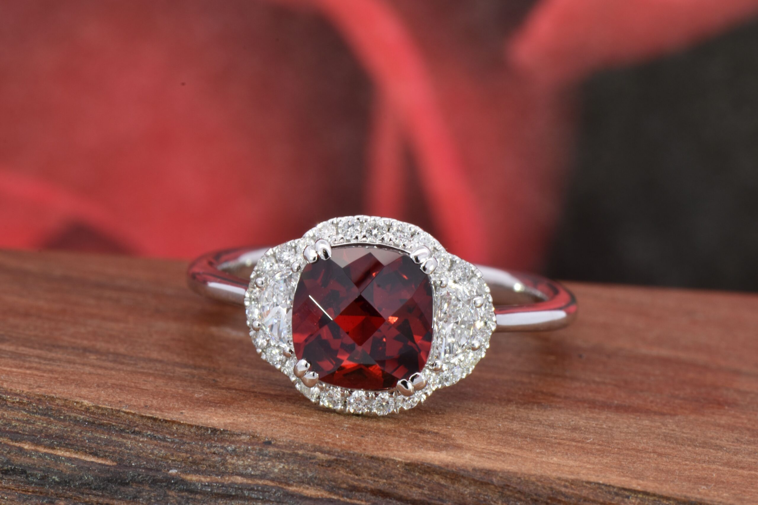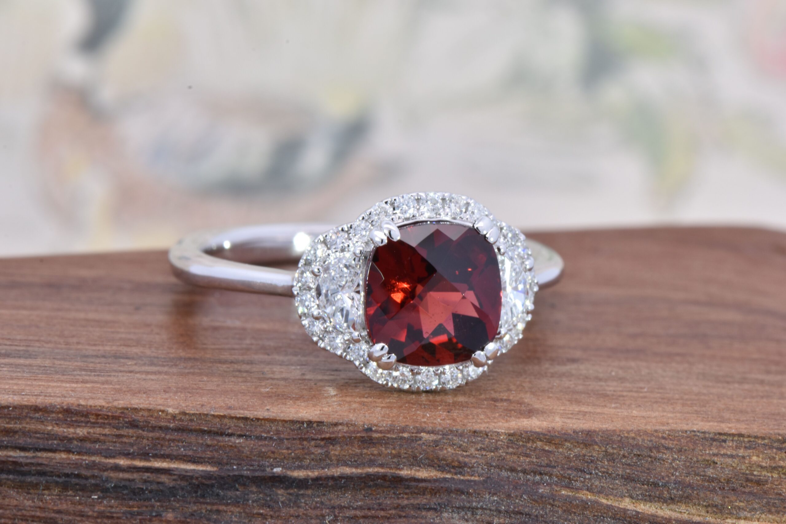 A 1.81 carat Cushion cut Garnet is beautifully set in between a matching pair of Half Moon Diamonds that weigh 0.19 carats total. Encasing these stones is a halo made of Round Brilliant Cut Diamonds that weigh 0.06 carats total. This ring is crafted in 14 karat White Gold and is currently a size 7.