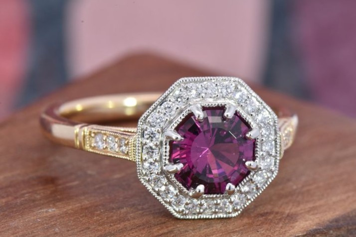Centering this ring is a dazzling 1 carat Rhodolite Garnet that is set into Platinum. Encasing the Garnet is Round Brilliant cut Diamonds that continue onto the shank. The Diamonds weigh 0.19 carats total. The shank of the ring is crafted in 14 karat Yellow Gold and is currenlty a size 7 that can be modified!