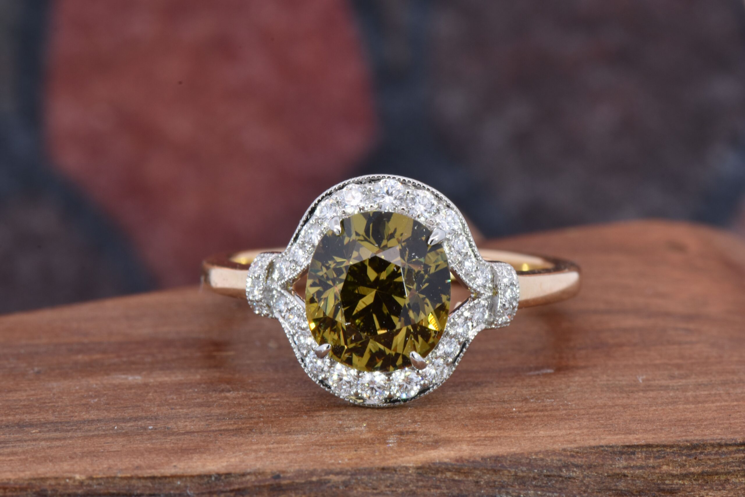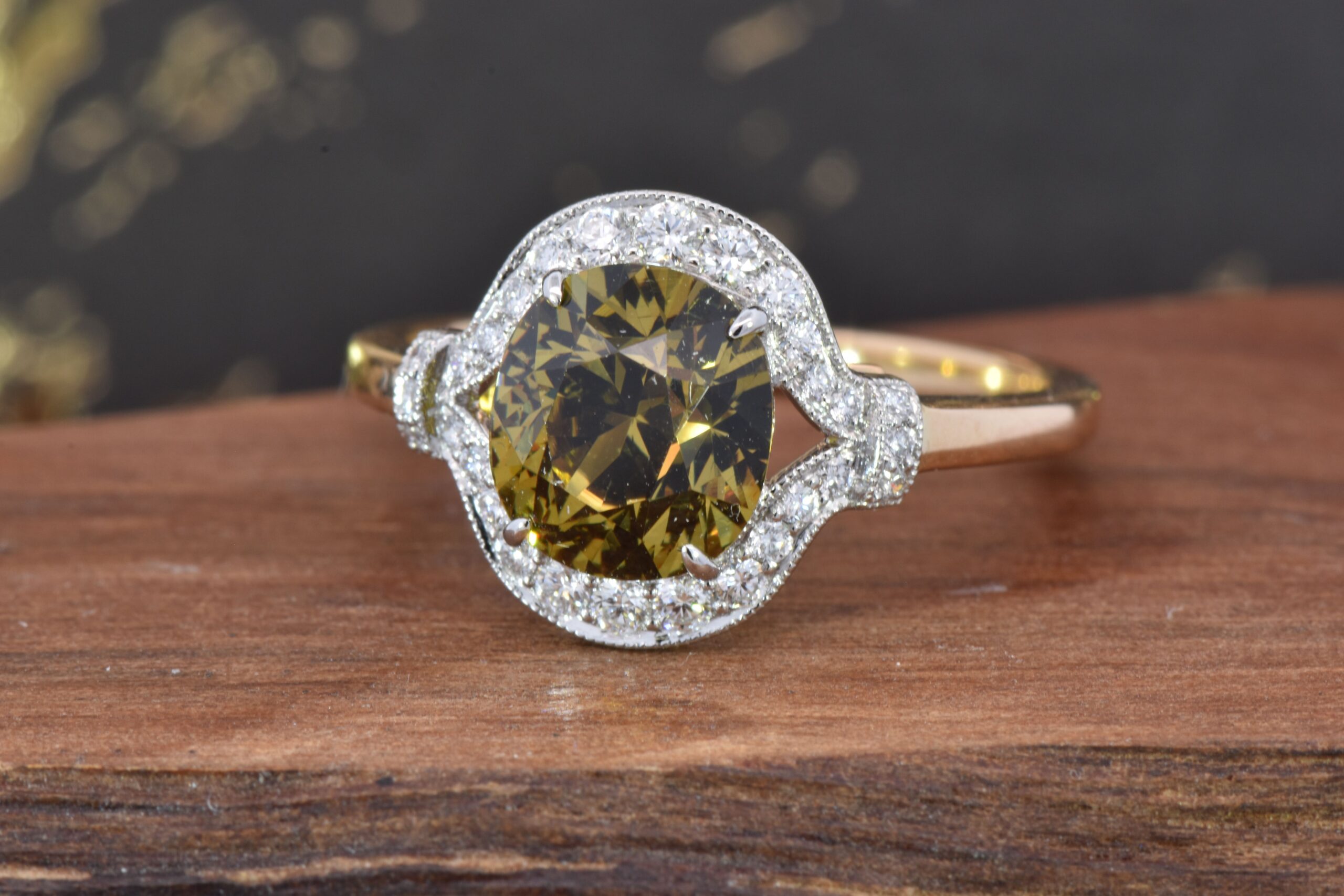 Crafted in 18 karat Yellow Gold and Platinum, this ring holds a gleaming 2.40 carat Cushion cut Mali Garnet. Surrounding the Garnet is a Round Brilliant cut Diamond halo. The Diamonds weigh 0.23 carat total. This ring is currently a size 7 and can be adjusted for the perfect fit!